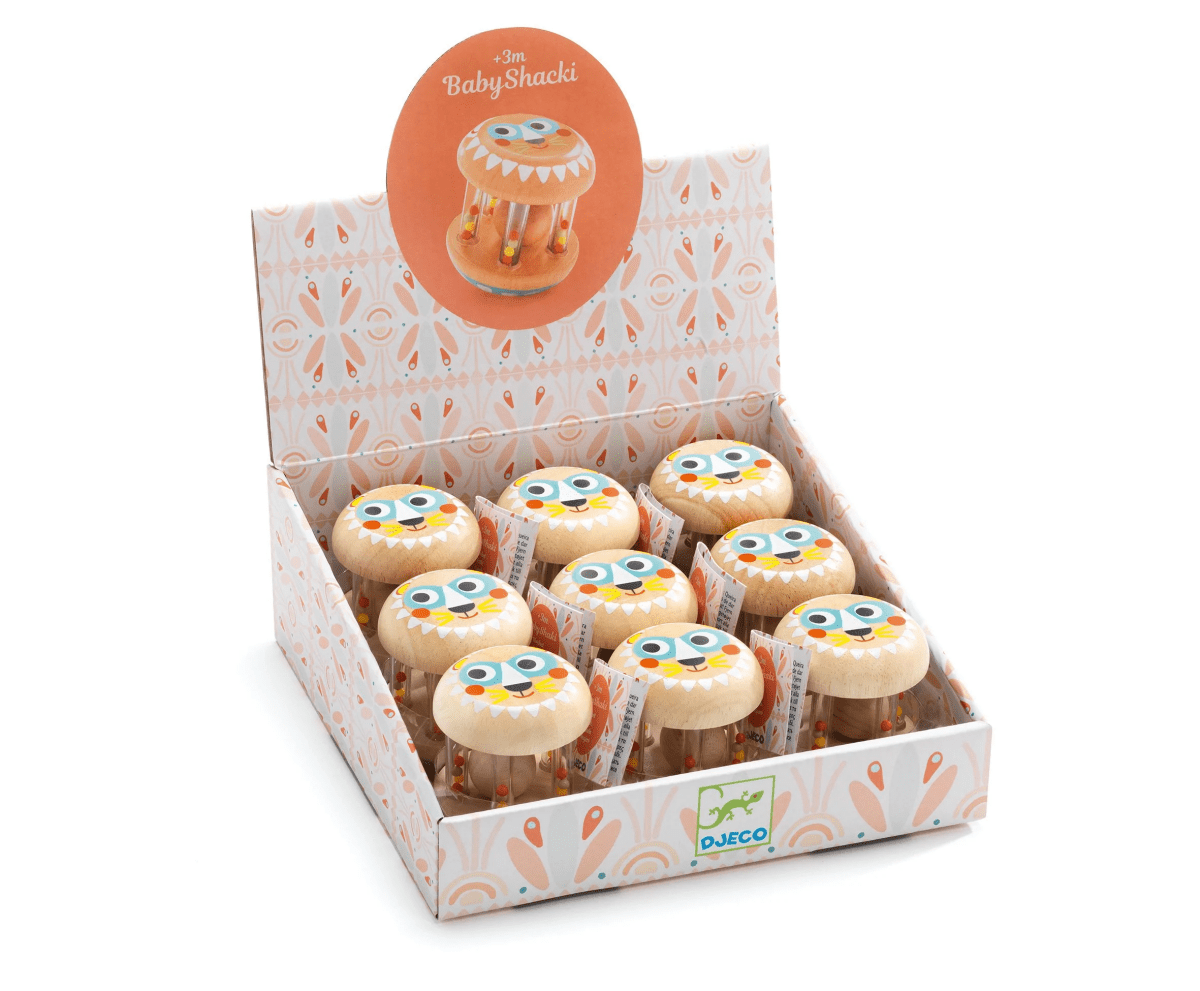 Contents: 9 rattles (wood and plastic) in a cardboard POP display
