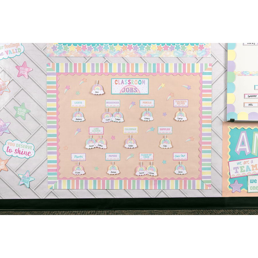 Use Pastel Pop Stripes Straight border trim to liven up your classroom! Create fresh looks for bulletin boards, windows, walls, and class projects. Mix and match with coordinating products (stickers, notepads, awards, etc.) for a classroom theme. Each pack has 12 pieces (3'' x 35'') for a total length of 35 feet of trim!