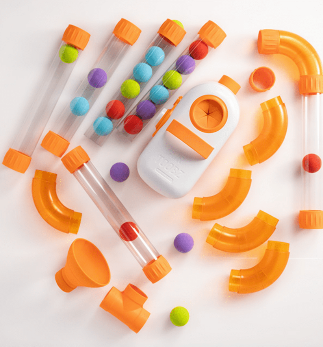 • Kid-safe turbine that sends foam balls flying through a network of modular tubes
