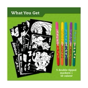 Contents include: 42-Page Book of Instructions and Inspiration, 18 Sheets of Stained Glass Coloring Paper, 5 Double-Tipped Colored Markers
