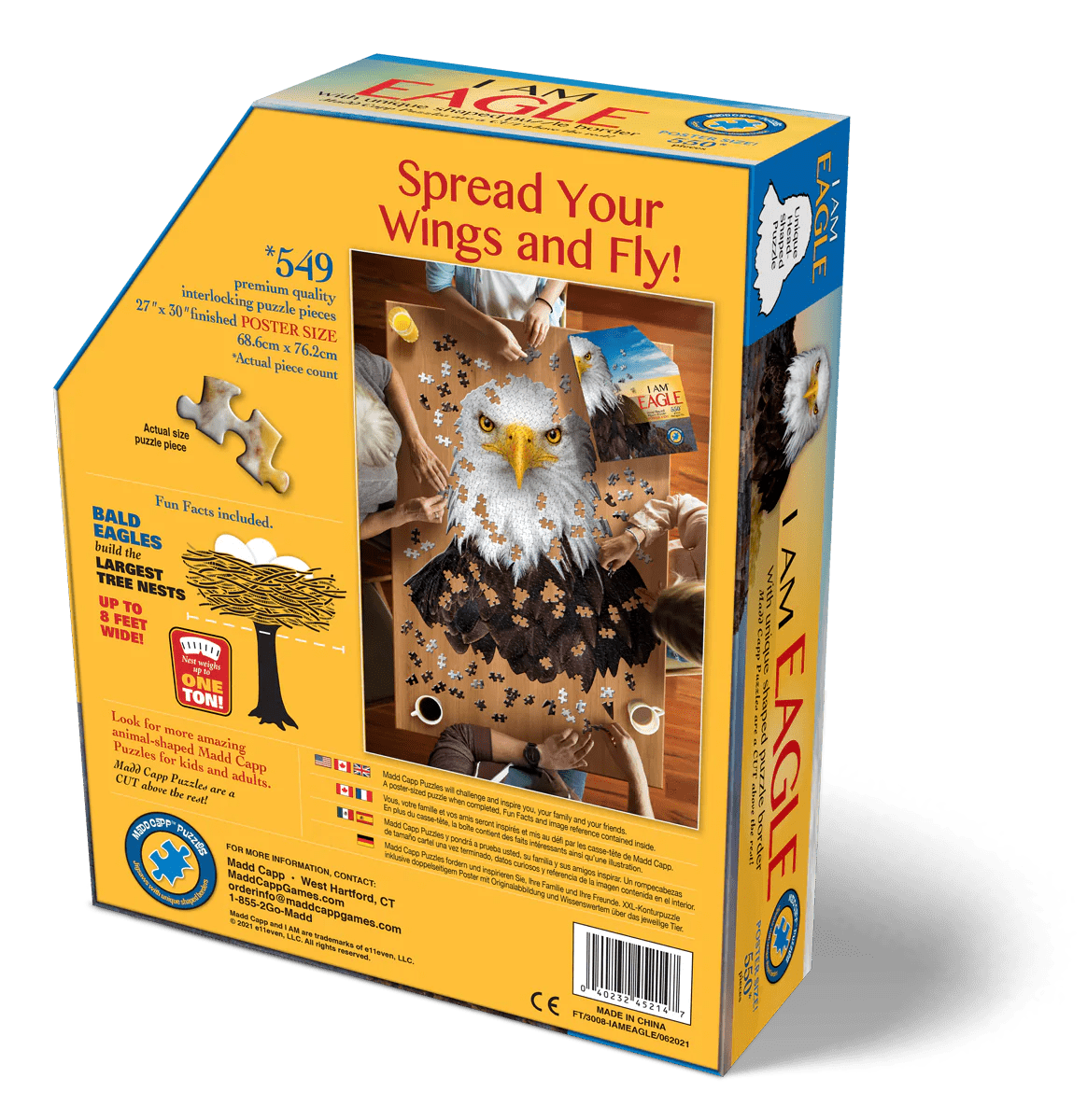 Each puzzle comes with an educational Madd Capp Fun Facts booklet. On one side is a fold-out puzzle image to hang as a poster or use as a reference. On the flipside is a wealth of amazing facts. Did you know, for instance, that when eagles lose a feather on one wing, they lose a feather from the other wing too?
