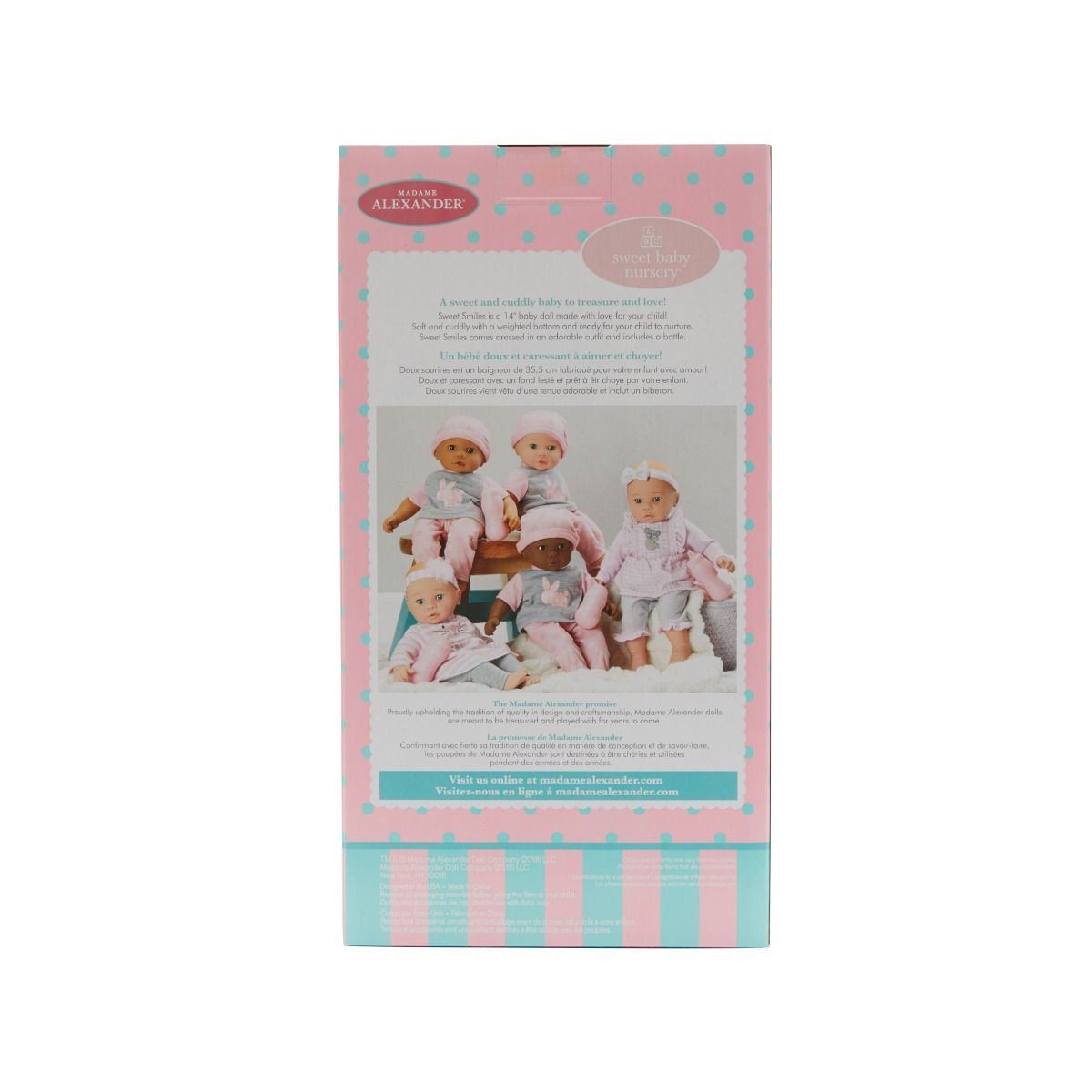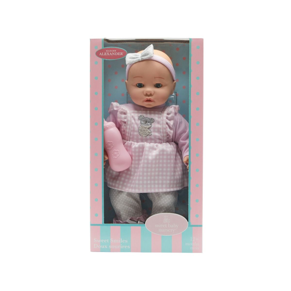 This 14" baby doll is the perfect snuggle buddy for your child! This light skin toned, blue eyed baby looks and feels like a real baby. The doll wears a sweet gingham pinafore with koala embroidery, a long-sleeve tee, polka dot ruffle leggings, and a headband with a bow. The Sweet Smiles baby comes with a bottle and is easy to clean with a damp cloth. Engage your child in imaginative, nurturing play with a doll that teaching kindness and empathy!