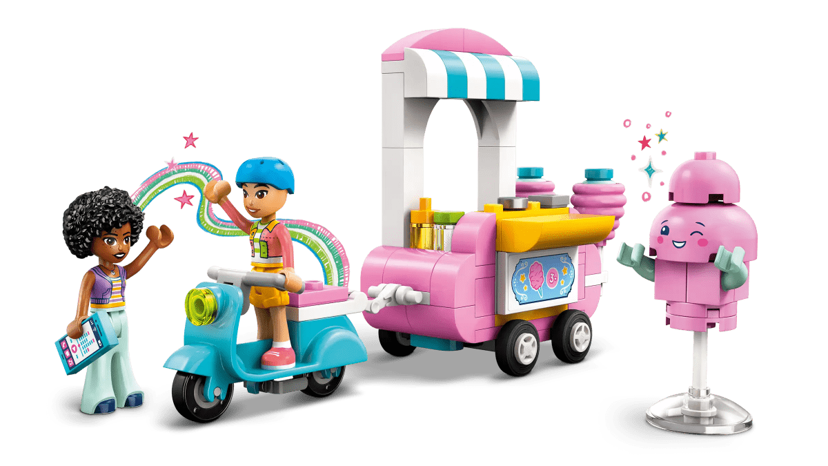 - Pretend-play building kit – This LEGO® Friends Cotton Candy Stand and Scooter set for girls, boys and young builders aged 6 and up comes with 2 minidolls, a food cart and a scooter with a kickstand