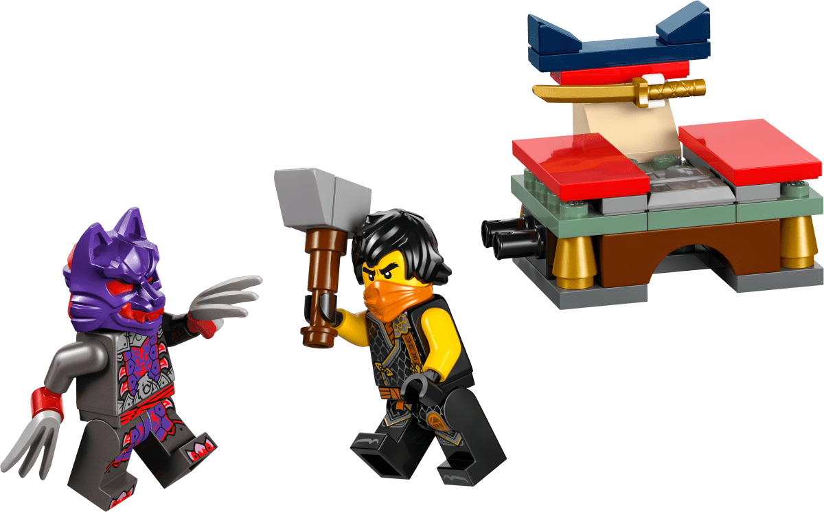 Ninja playset lets kids role-play battles between Cole, armed with a katana sword accessory, and a Wolf Mask Warrior with its claws to win a golden staff.