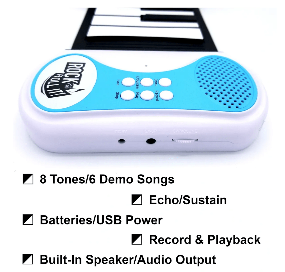 • MULTIFUNCTIONAL KEYBOARD FOR EVERYONE: Features multiple keyboard tones and demo songs, record & playback, echo/sustain, built-in speaker with volume control, and audio output. Perfect for everyone from beginner to master, children to adults - rock out then roll it up!