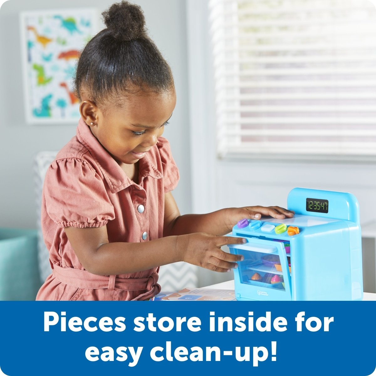 This mini oven is baking some big learning! Use 6 baking pans to sort and prepare a 30-piece collection of colorful mini sweets, including cake, pie, cookies, cupcakes, and donuts. A spatula sized for little hands helps build fine motor skills one treat at a time. Includes activity cards for even more ways to learn! All pieces and cards store inside the oven for an easy kitchen cleanup! Discover even more minis with our Sorting Snacks Mini Fridge and Mini Farmer’s Market Sorting Set! Age 3+ | Grade PreK+.