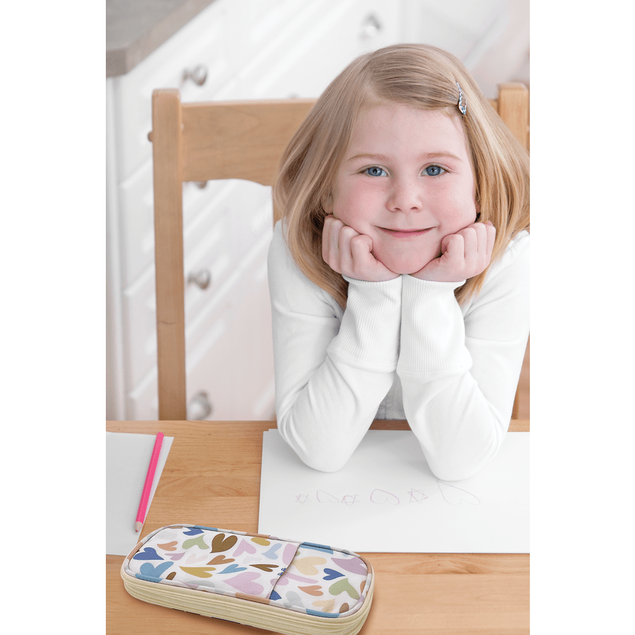 Spread love with this pencil case full of hearts! This pencil case is sturdy, durable, expandable, and can store up to approximately 50 pens or pencils!