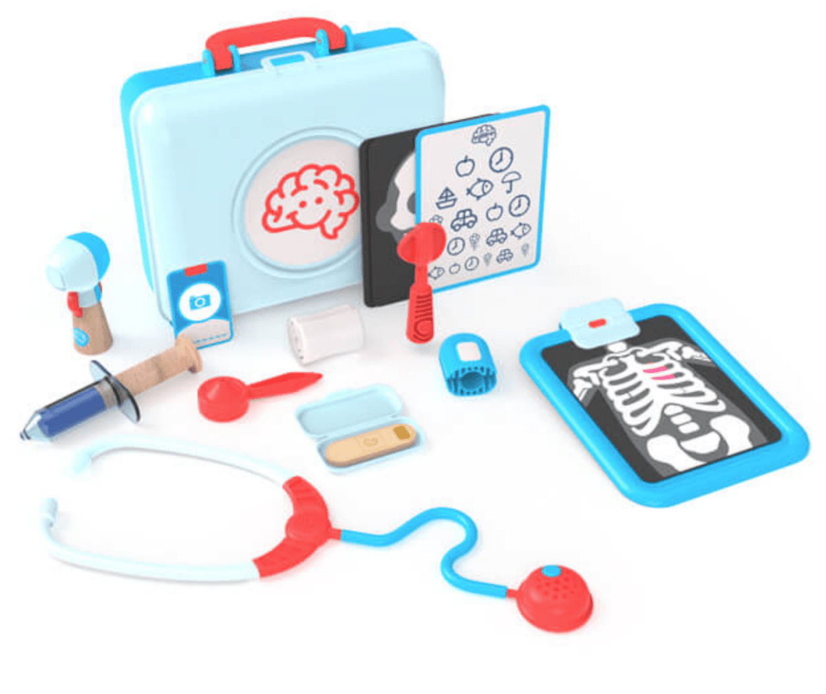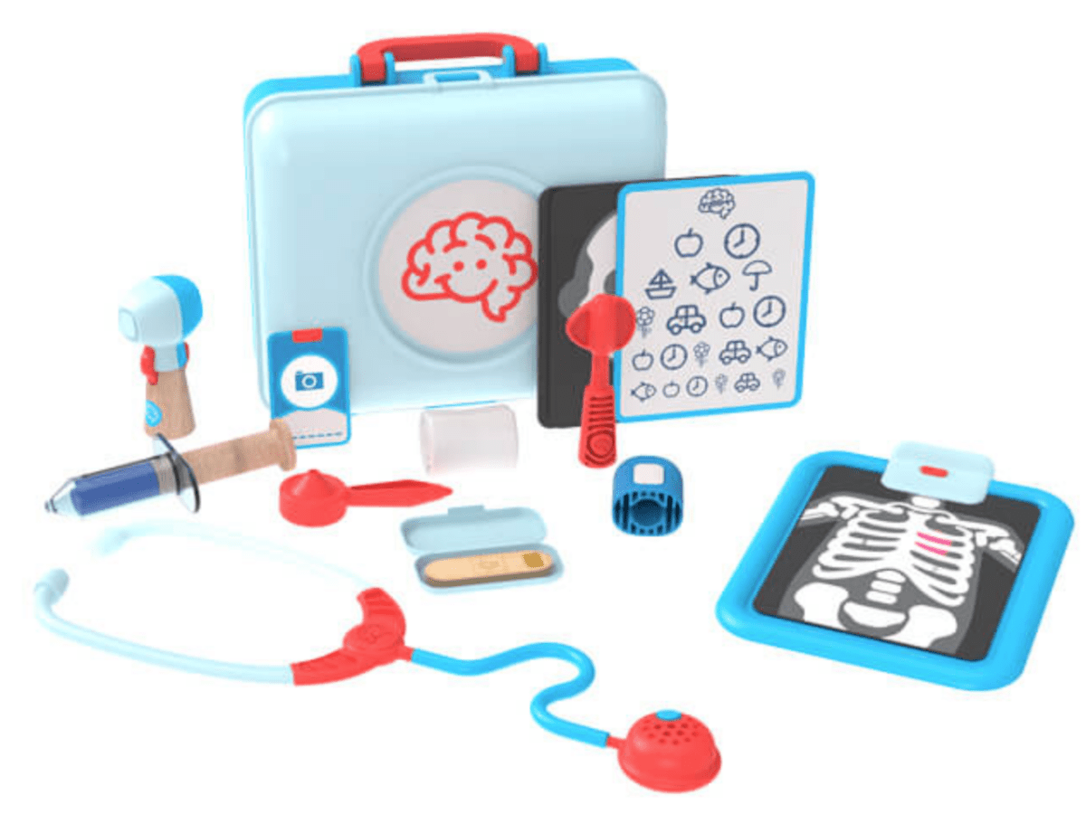 A thermometer, a finger oximeter, an otoscope, a reflex hammer, a stethoscope with real heartbeat sounds, a box of bandages, a syringe, health charts, a light-up x-ray panel, and more, all stored in a snap-shut case...
