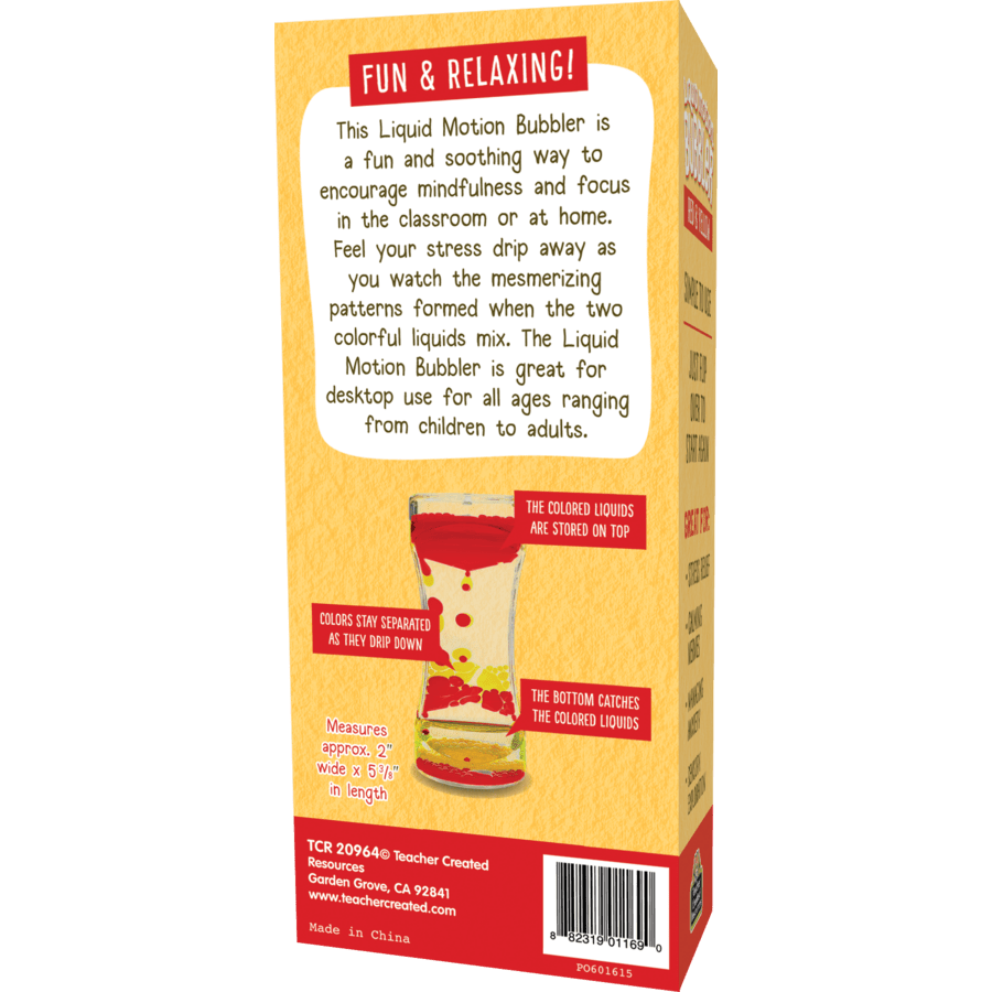 This Liquid Motion Bubbler is a fun and soothing way to encourage mindfulness and focus in the classroom or at home. Feel your stress drip away as you watch the mesmerizing patterns form when the two colorful liquids mix. It’s fun, relaxing, and simple to use—just flip over to start again. It's a perfect desktop tool for all ages ranging from children to adults. Measures 2" x 5⅜".