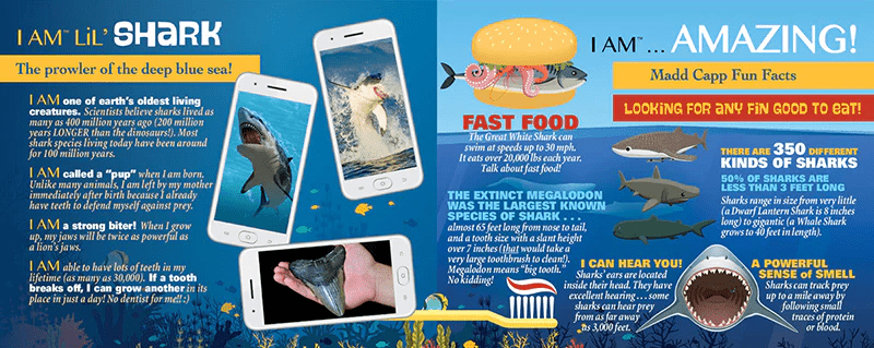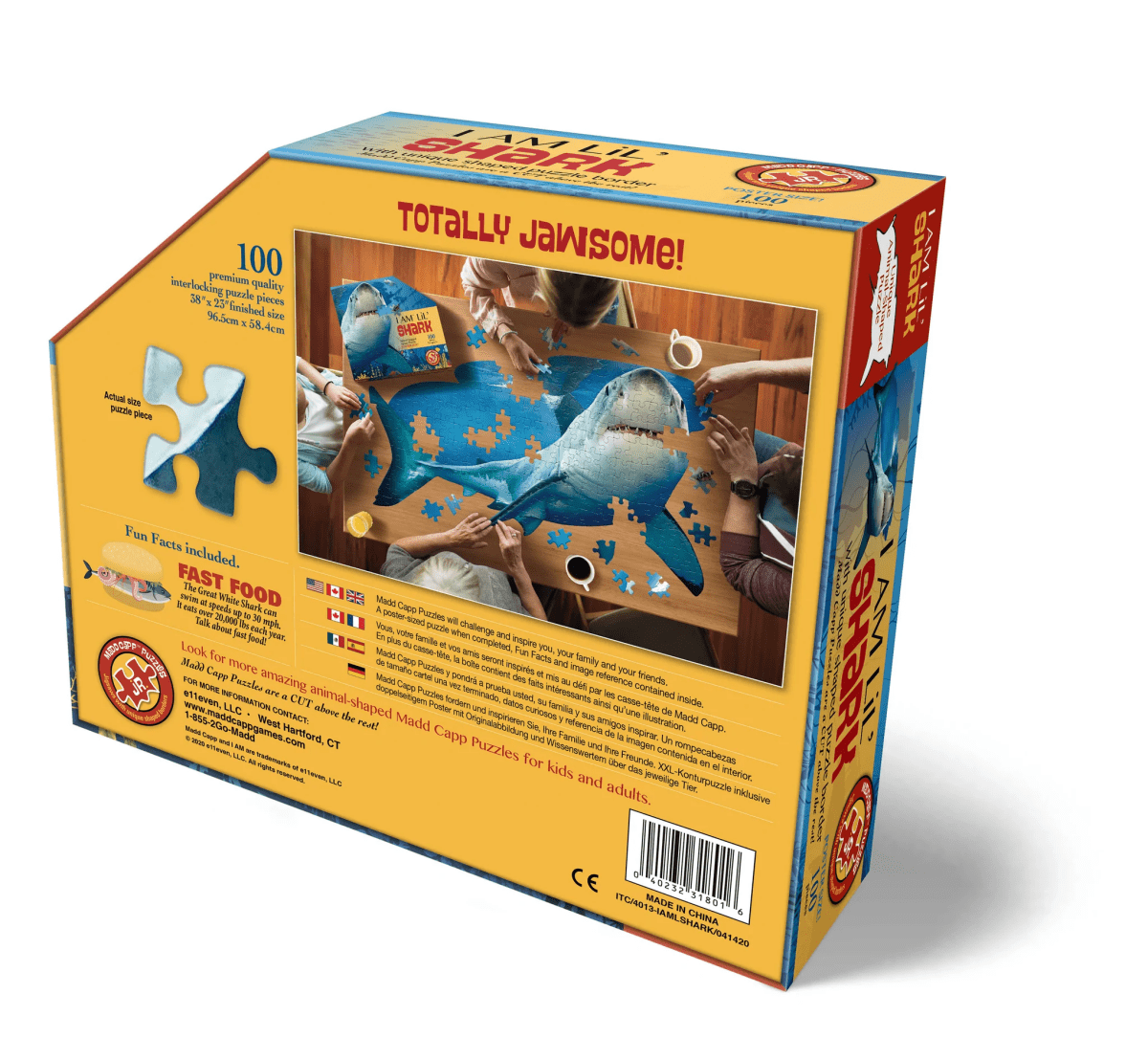 Each puzzle comes with an educational Madd Capp Fun Facts booklet. On one side is a fold-out puzzle image to hang as a poster or use as a reference. On the flipside is a wealth of amazing facts. Did you know, for instance, that unlike many animals, sharks are left by their mothers immediately after birth, because they already have teeth to defend themselves against prey?