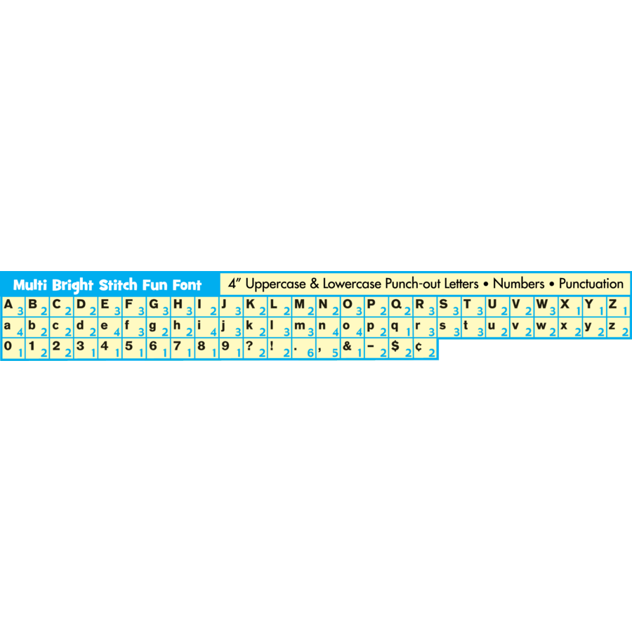 Punch and place 4" Fun Font letters for the "fun" way to display your message! Includes 60 uppercase, 68 lowercase, 12 numerals 0–9, and 22 punctuation pieces in one affordable package. 162 total pieces.