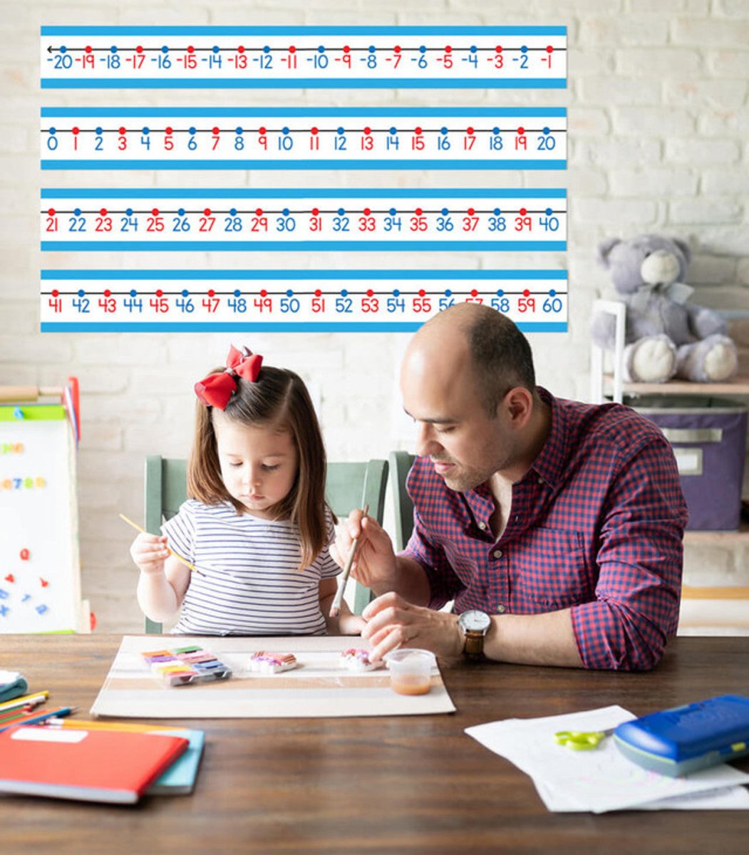 This Number Line Bulletin Board Set supports Common Core State Standards with 14 number line strips with numbers ranging from -20 to 120. Each of the 14 number line strip measures 24” x 5 3/4”.
