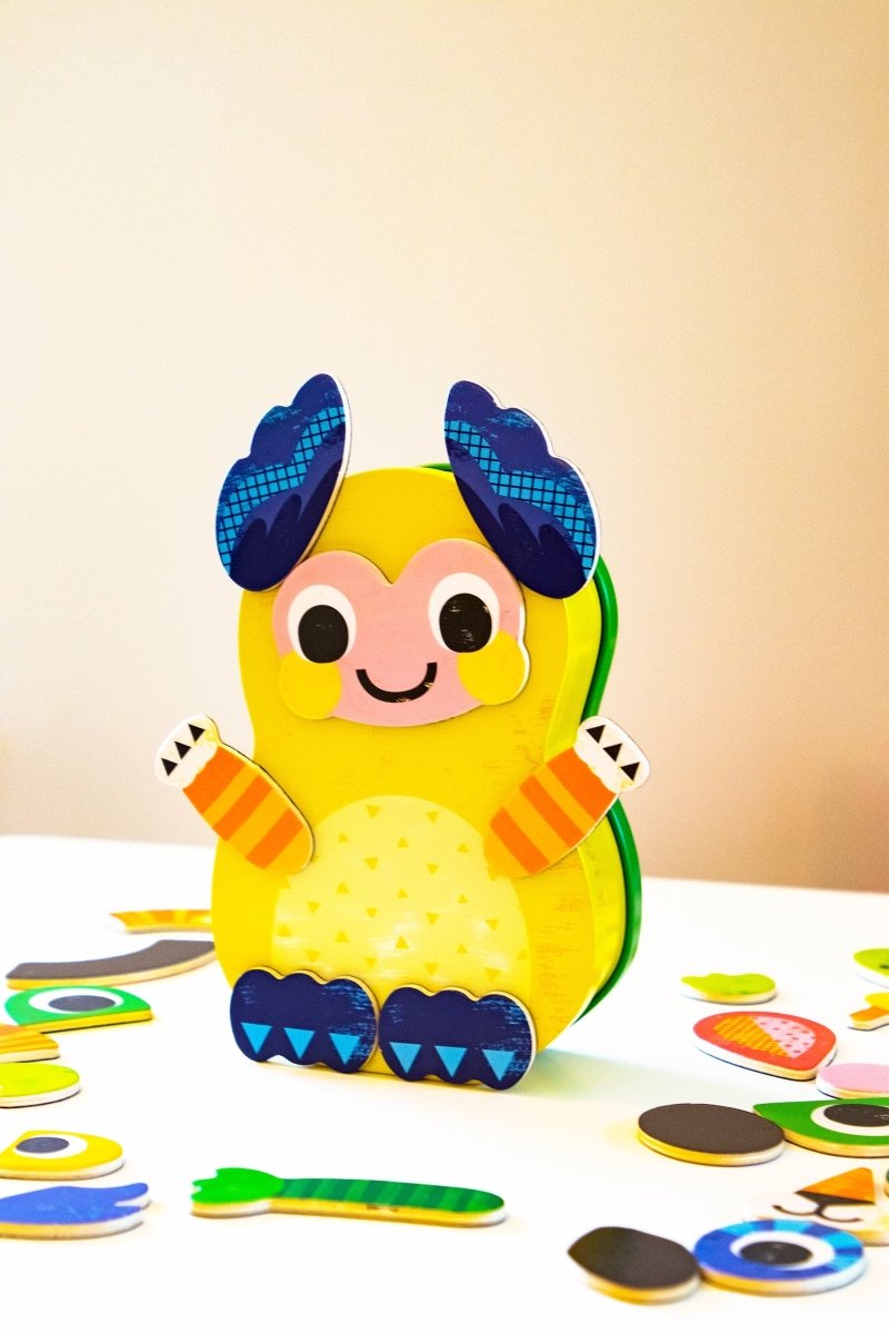 Enjoy creating a lion, a butterfly, a parrot, a frog and more with these wooden magnets and metal box.